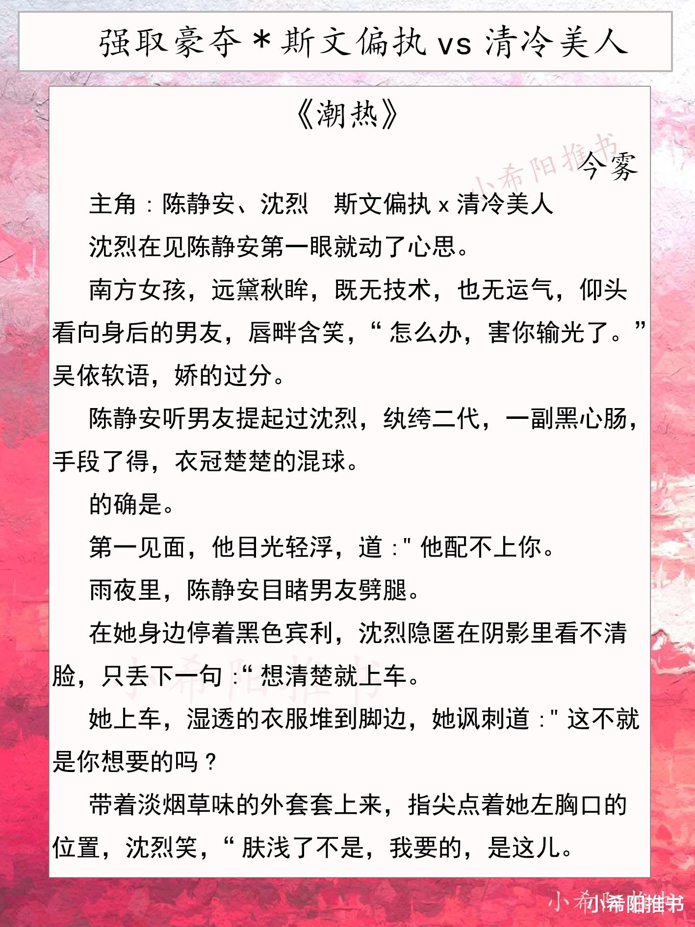 《潮热》这本属于强取豪夺类型,喜欢看的宝子斯哈斯哈!斯文败类霸道男主与清冷琵琶美人,全程高能修罗场,两人设定也很带感!