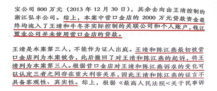 钱江置业因卷入牛某齐、王某、陈某燕三方抵押贷款直接造成损失,牛某齐却仍以营口金店起诉钱江置业,该案二审辽宁省高法1031号判决已经明确:数千万贷款资金均流入了牛某齐及营口金店、王某、陈某燕的关联账户。案件判决认定钱江置业公司的股东会、董事会对抵押贷款不知情,也没有任何公司授权的证据,故而关联案件认定钱江置业对抵押贷款一事并不知情。