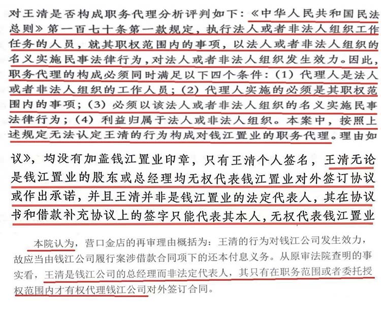 其次,关联案件在省高法1031号生效判决和最高法1919号裁定均认定了该抵押行为仅为个人行为,与钱江置业公司无关,并作出“王某无论是钱江置业的股东或总经理均无权代表钱江置业对外签订协议或作出承诺。并且认定王某并非是钱江置业的法定代表人,其签字只能代表其本人,无权代表钱江置业对外签订借款协议。”以及“没有证据显示王某在签订协议书时,具有对外授权的客观表象。”的前提下,张某丽作为一个市中级法院的庭长,在该案证据与关联案件相同的情况下,作出了完全相反的认定。案件背后究竟有多少幕后勾兑和利益输送,有关司法纪检部门正在进一步调查处理。