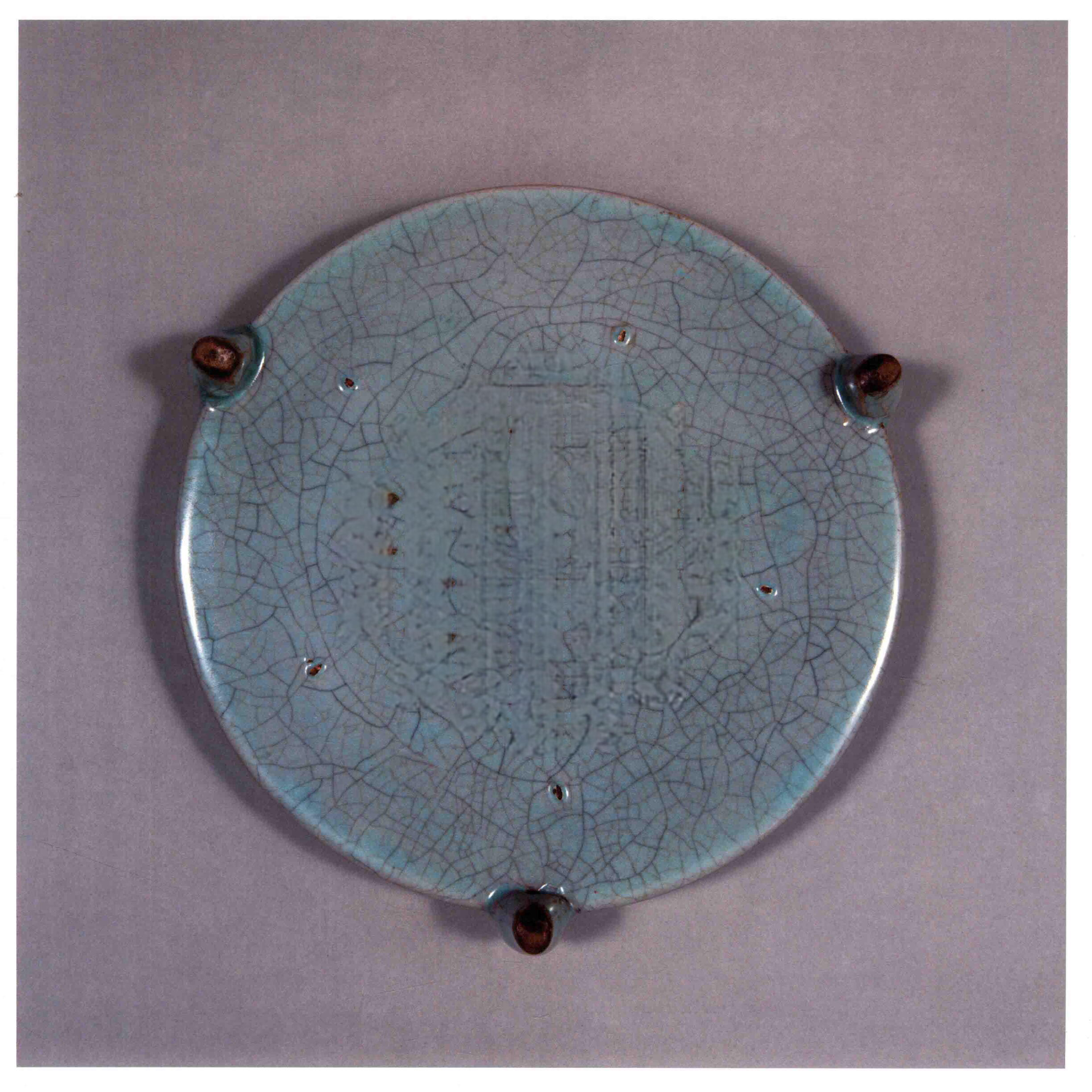 承盘直口、浅壁、平底,底下承以三个兽足形足。通体内外满施天青色釉,釉面开细碎冰裂纹片。外底有5个细小支烧支钉痕,并镌刻乾隆皇帝御制诗一首。诗曰:紫土陶成铁足三,寓言得一此中函。易辞本契退藏理,宋诏胡夸切事谈。