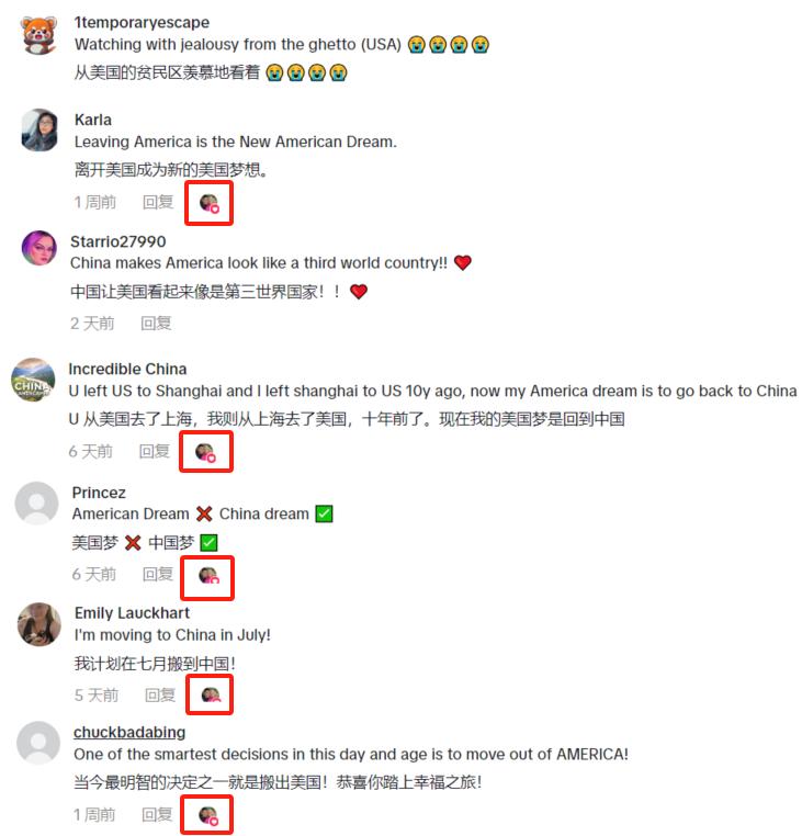逃离美国,前往中国生活,似乎成为了许多美国年轻人的“美国梦”。评论区几乎是一片羡慕的声音,视频作者也给其中好几位想离开美国的留言点了赞,见下图:
