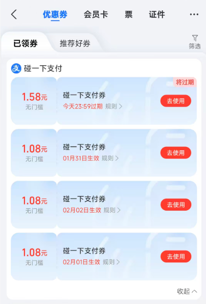 如果大家想让自己的碰一碰红包金额大一点的话,可以多申请几个支付宝,我自己是有3个支付宝,哪个支付宝的碰一碰红包金额最大,就用哪个支付,其他2个暂时放弃。比如下面图片上的这些红包,都是低于2元的,我就不用去用掉。
