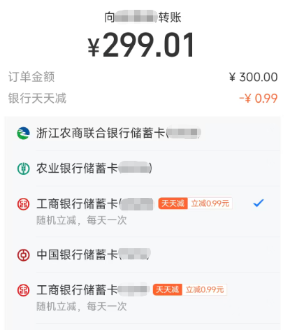 然后在支付宝大号上,每天早晨试一下付款这10000给小号哪个银行有活动,没有就放着别动,有立减活动的话也别急着付款,试试付款能参与活动的最低金额是多少,简言之就是,以最小投入获取最大收益。