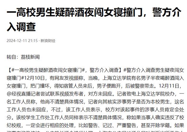 警方对于醉酒男生半夜撞女寝门的情况,回复是正在调查中,具体情况不便透露。