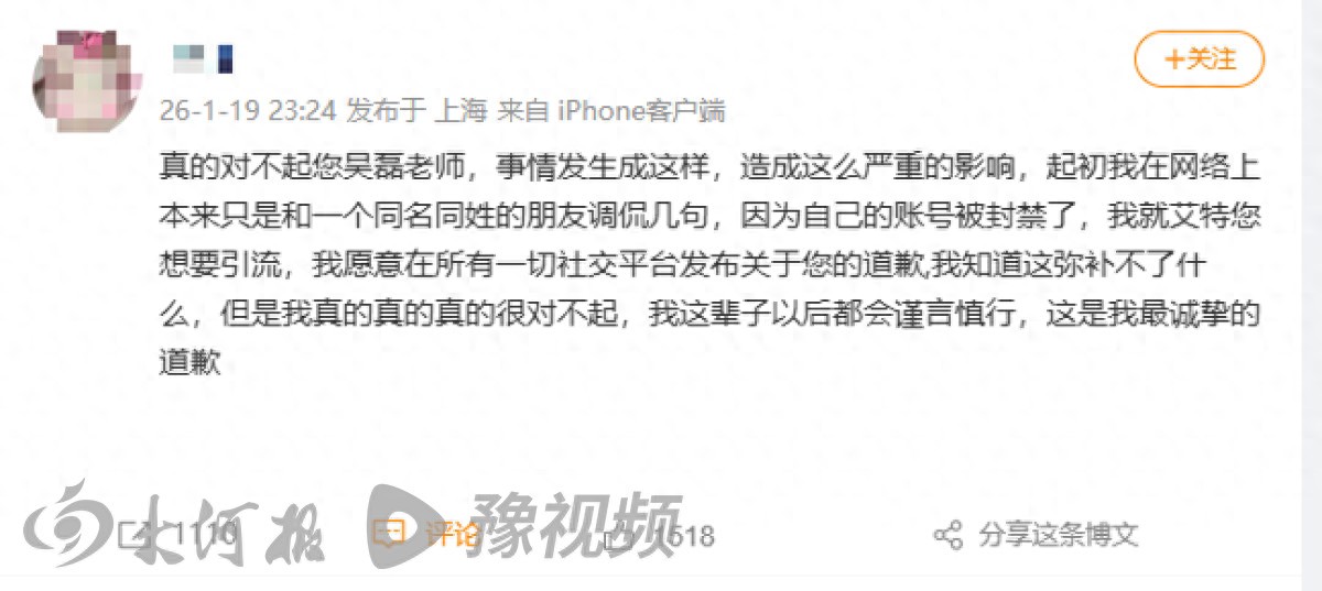 1月20日晚,另一疑似白珊珊账号公开道歉,承认“为引流@吴磊”,称“知道道歉弥补不了什么”。截至发稿前,吴磊方面未就此再进行相关回复。