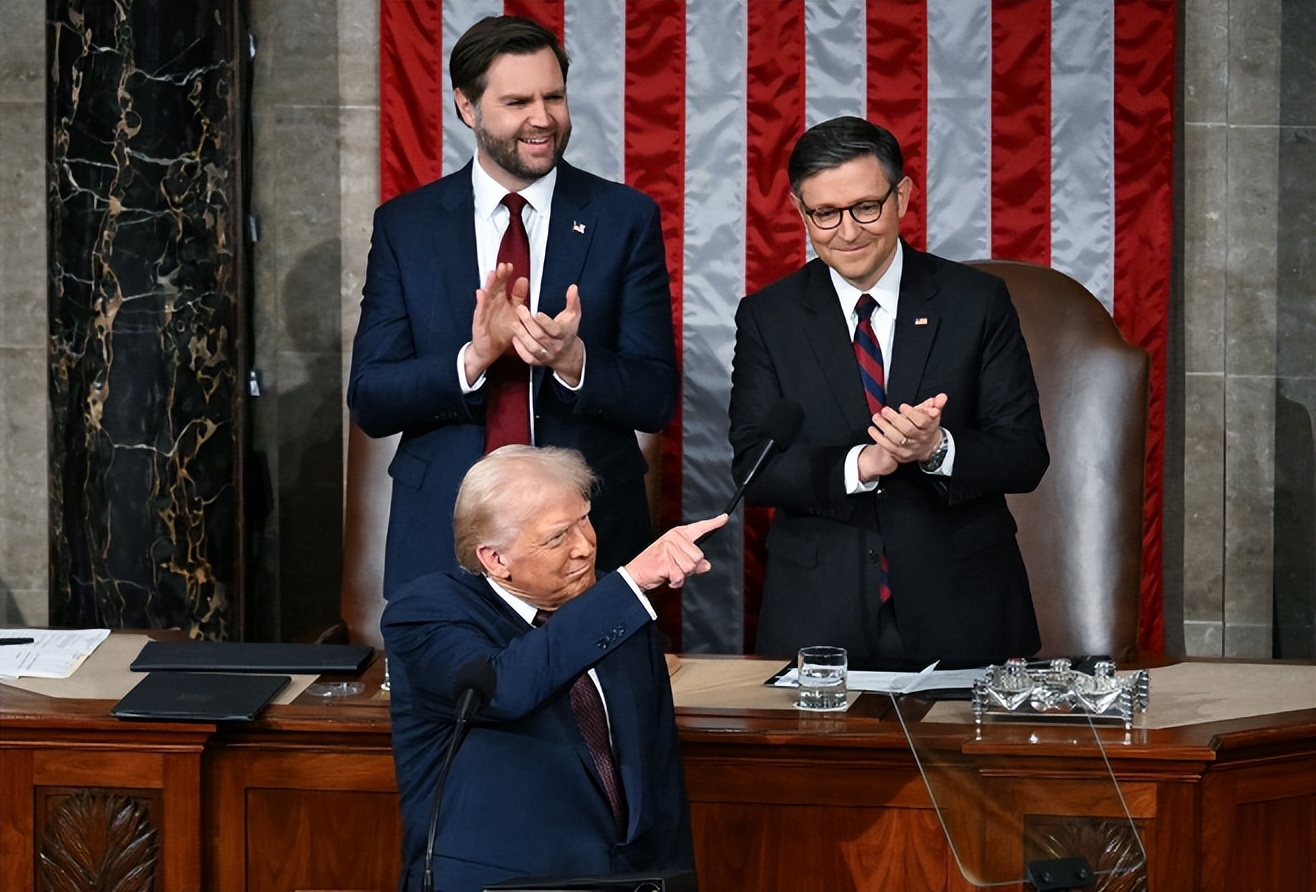 共和党议员的表演堪称行为艺术。众议员格林戴着"特朗普永远正确"的特制红帽,将国会变成应援会场;马斯克在听到总统致谢时以军礼回应,展现硅谷与白宫的新结盟。特朗普高调宣布整顿司法体系,誓要解雇"不配合的官僚",实则剑指阻碍他政策的联邦法官。