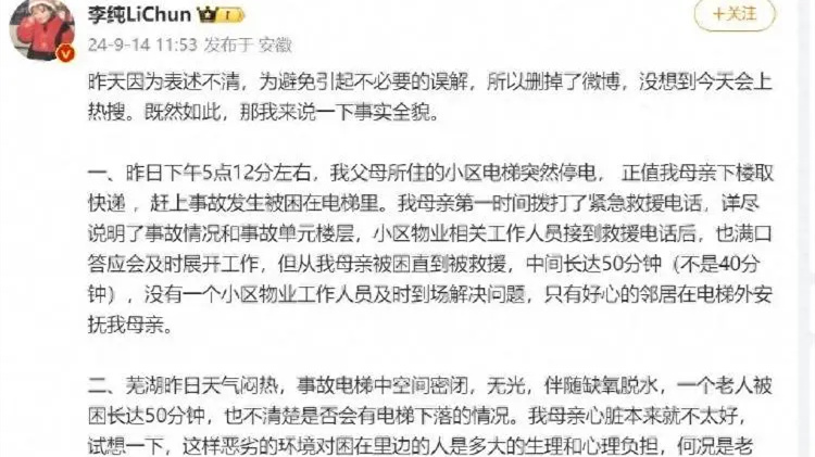 随后,李纯删除了最初的微博,但这份沉默并未平息风波。14日中午,她再次发声,用更加冷静而坚定的语气,控诉物业的不作为,并呼吁相关部门介入调查,确保类似事件不再发生。这一举动,不仅展现了她作为公众人物的责任感,也触动了无数人的心弦。