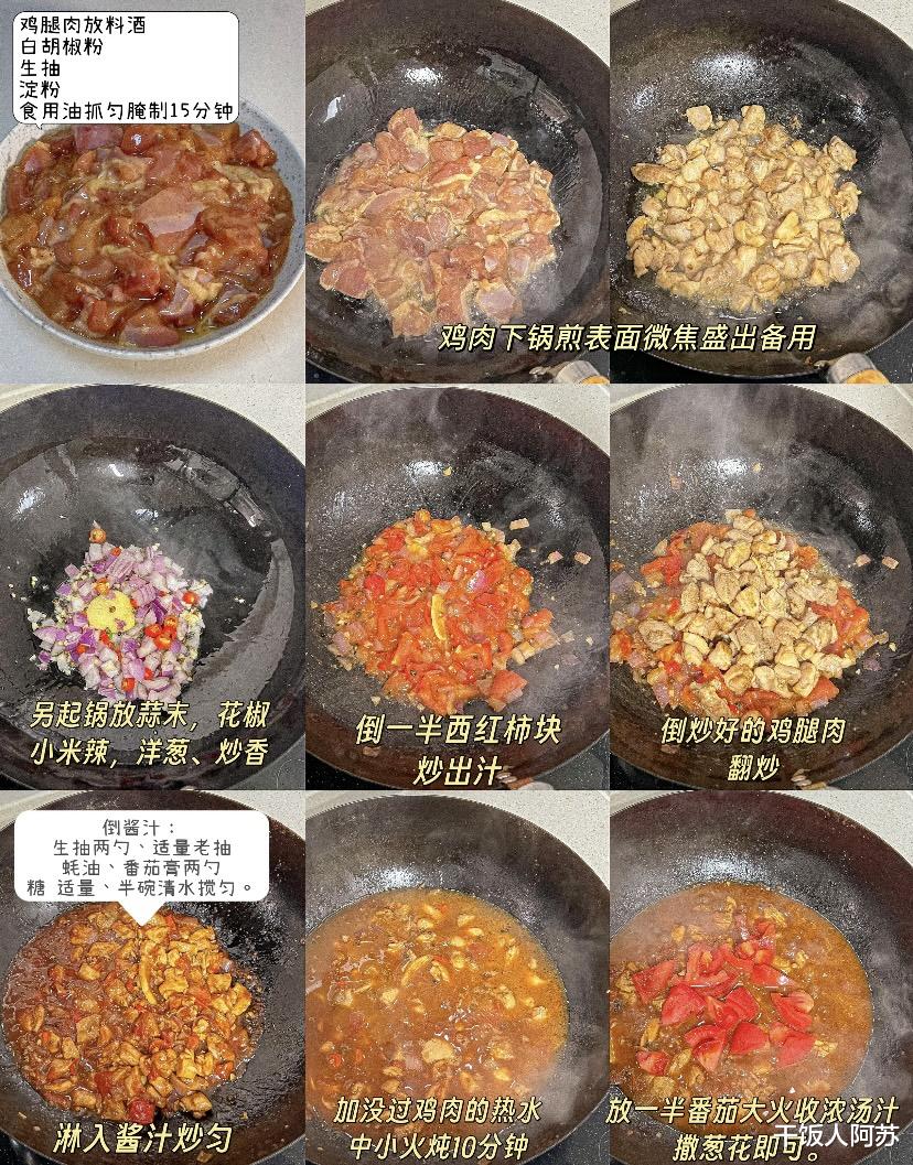 接下来是这道菜的灵魂步骤——炒底料。不用洗锅,利用锅里剩下的底油,放入葱花、蒜末、花椒、小米辣和洋葱丁,小火慢慢煸炒出香味。当香味扑鼻而来时,倒入切好的一半西红柿块。这里有个小技巧,西红柿一定要多炒一会儿,一边炒一边用铲子按压,直到西红柿炒出红红的汤汁,变成糊状,这样汤底才会有浓郁的番茄味。底料炒香后,把之前煎好的鸡肉倒回锅里,快速翻炒,让每一块鸡肉都裹上红红的番茄酱汁。