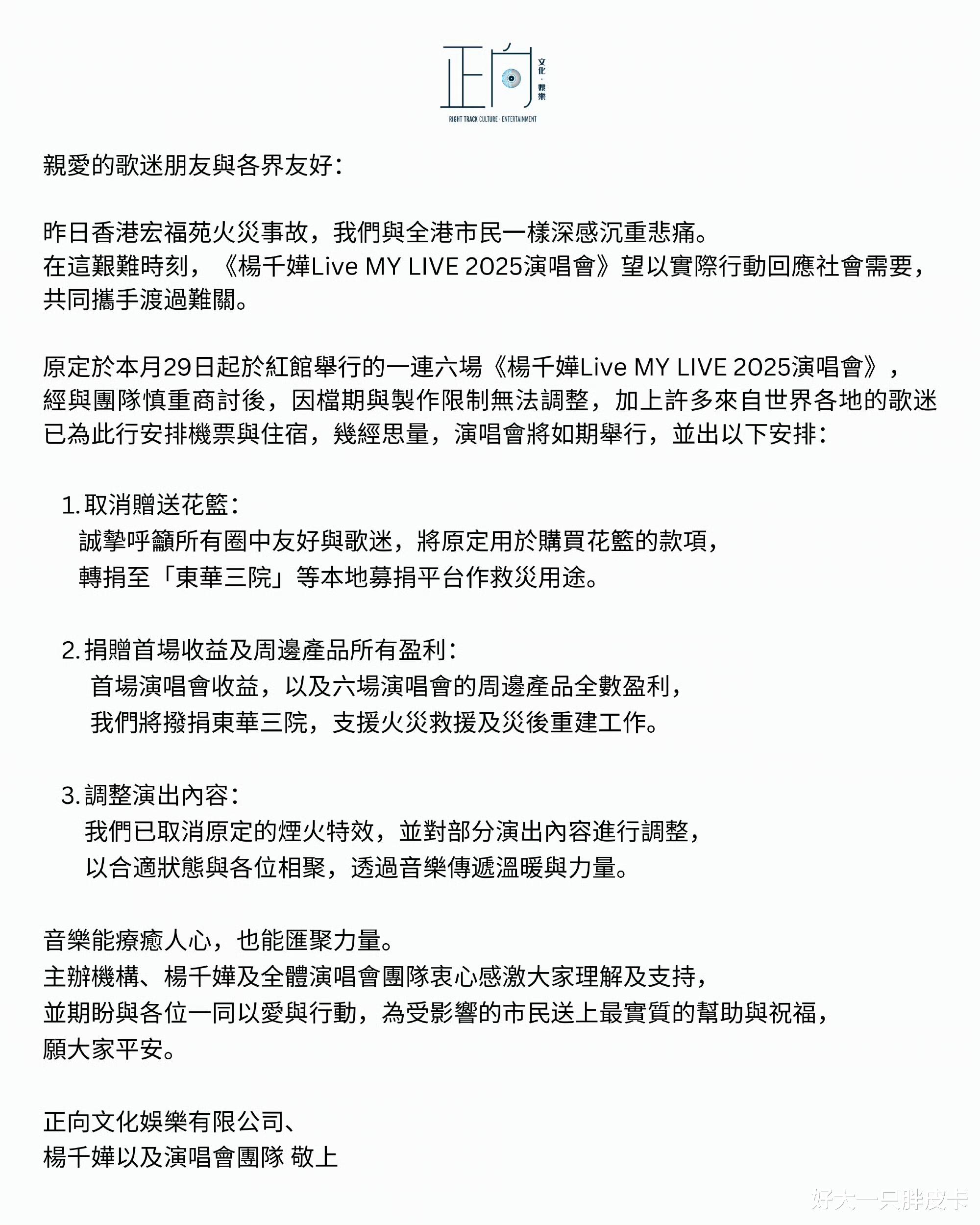 如果说回香港红馆开唱,是对歌迷和自己的交代;那么面对突发的大埔火灾,这次在11月29日-12月4日上演的「Live My LIVE」在执行上的不顺利,它则映射出歌手和团队对社会与公众的担当。后者面对的是整个城市集体陷入的悲怆和低迷情绪,是延期/取消,还是如期上演——如何做,做到什么程度,这是抛给所有临近有演出或宣传计划艺人的难题。