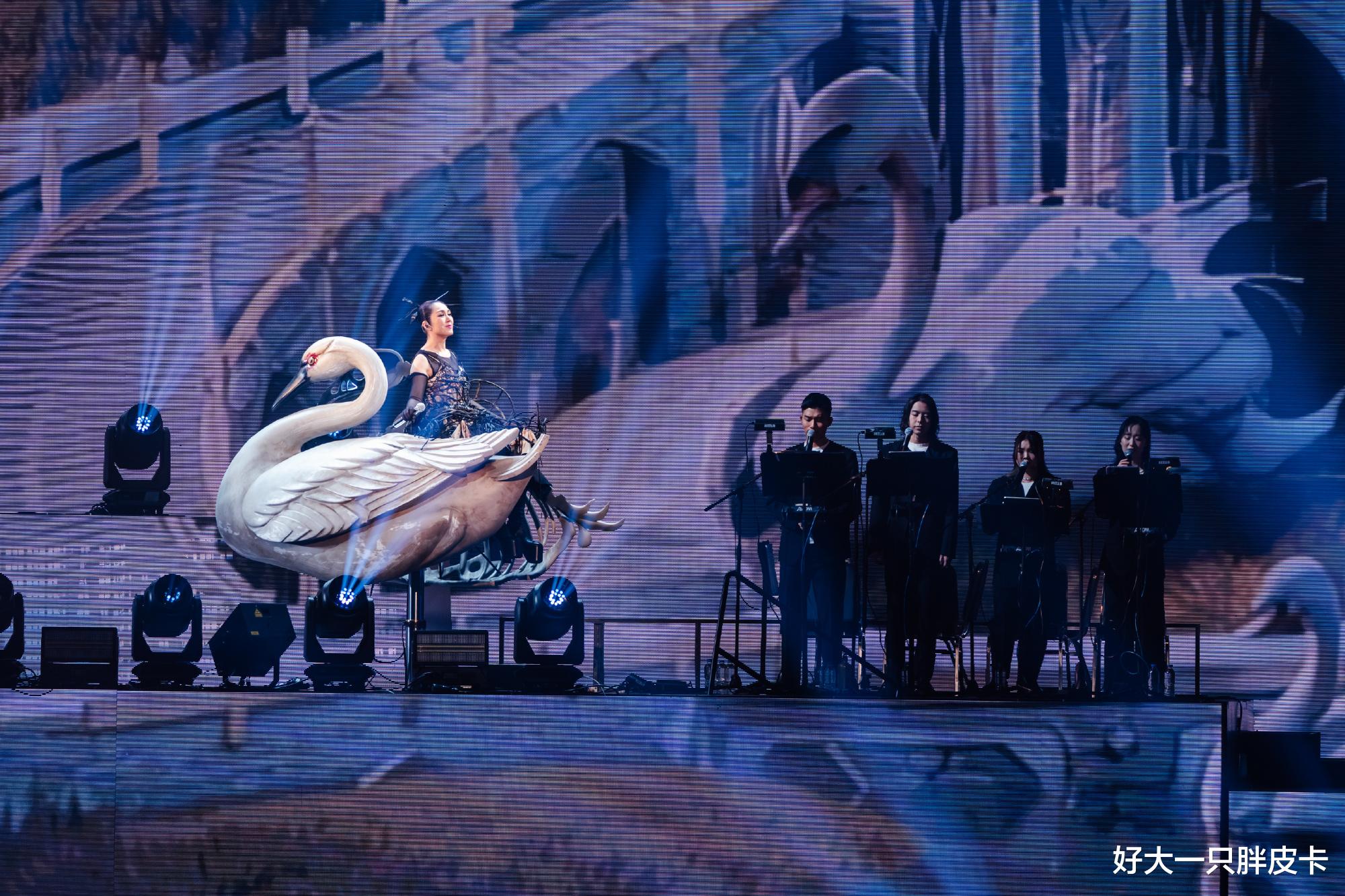 由承载她现场最多笑与泪的坐标看杨千嬅,红馆有太多近在咫尺的见证,但在某段时期,它又变得遥不可及。这种“倒转”,不乏来自周遭大众的审视与投射,艺人总不能避免面对社会的压力,要学会在社会改变中建立起安全感是每个Artist的必修课,他们势必要同迷茫与负面情绪共处。红馆演唱会的第二Part「归零(Infinite Zero)」尤其能感受到这种深陷挣扎矛盾后的释放,好像是这次红馆唱到歌曲《一叶舟》时的那句歌词「迷失在这地球 为何不顺性放手/载沉 又再浮 太率性不甘心颤抖」,也能在另一首《白天鹅》舞美中找到规律。于是,红馆在这刻同样有了别样的意义,不再是基于30周年的纪念式心态,而是在日常生活中回归自我本真,这是她毅然决然要回到香港、要在红馆开唱的理由。