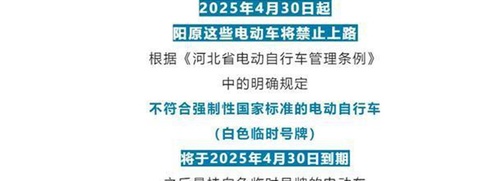 先说说河北吧。在那儿呢,有一种白色临时号牌的电动车,这就像是给它的一个特殊标记。不过呢,按照《河北省电动自行车管理条例》的规定,这种不符合强制性国家标准的电动自行车,它的过渡期就像一场限时的旅行,到2025年4月30日就结束啦。从这一天开始呀,只要有这种号牌的非标电动自行车,就像被施了禁令一样,一律不准上路哦。像河北的石家庄、阳原这些地方都已经发出了通知,那些还在骑这种车的小伙伴们可得注意啦。不过要是想继续合法上路,也不用太担心,可以参加以旧换新的政策补贴,换一辆符合国家强制性标准的电动自行车就好啦。