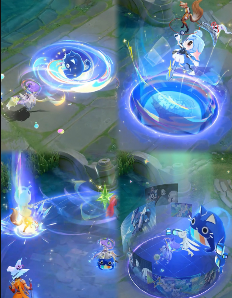 从皮肤外观看,小乔-时之魔女保留了魔女帽和单丸子头的特征,同时加入了电视彩条、火箭、行星、机甲等元素,营造出一种动漫风格的氛围。主色调选用了充满魔法氛围的蓝色,这一选择巧妙地营造出一种神秘而梦幻的视觉感受。机甲元素的引入尤为惊艳,它不仅与小乔的可爱形象形成了鲜明对比,也展示了制作组的创意和用心。