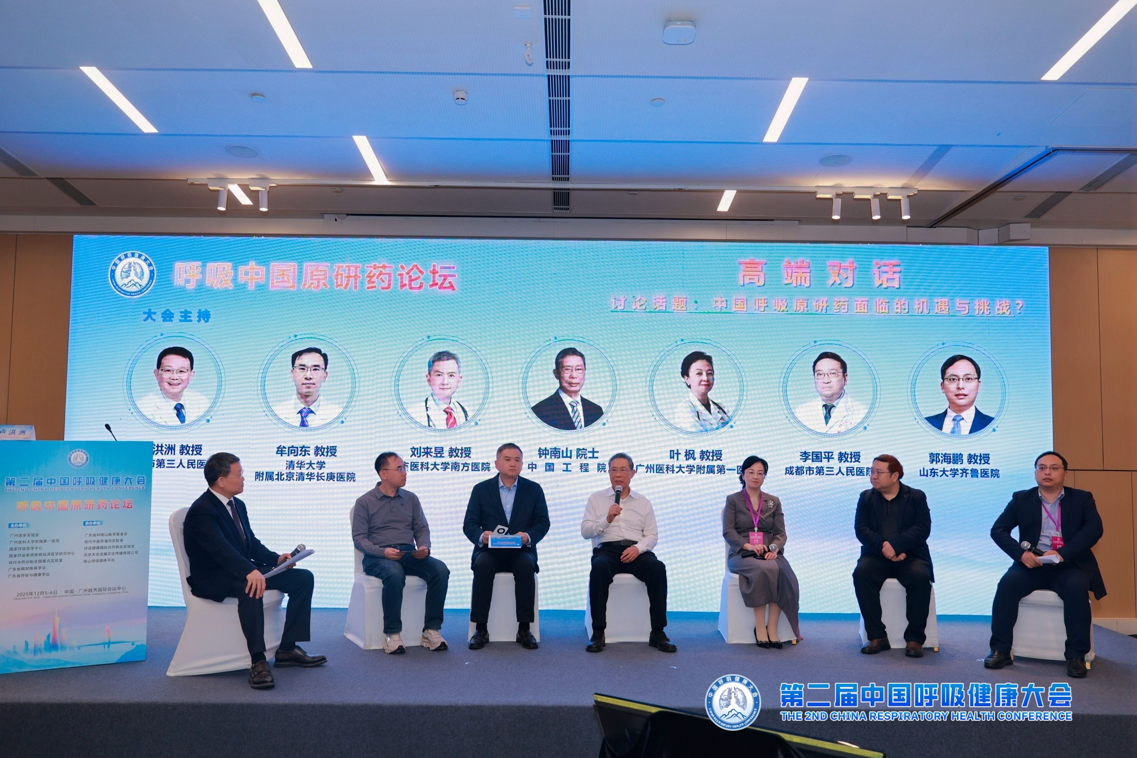 论坛特设高端圆桌对话环节,由深圳市第三人民医院卢洪州教授主持,钟南山院士、南方医科大学南方医院刘来昱教授、清华大学附属北京清华长庚医院牟向东教授、广州医科大学附属第一医院叶枫教授、成都市第三人民医院李国平教授、山东大学齐鲁医院郭海鹏教授围绕“中国呼吸原研药的机遇、挑战与突破路径”展开深度探讨。