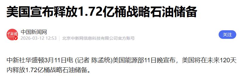 3.《美国能源部:为稳定油价,下周起从战略储备释放1.72亿桶原油》——中新网,2026年3月12日