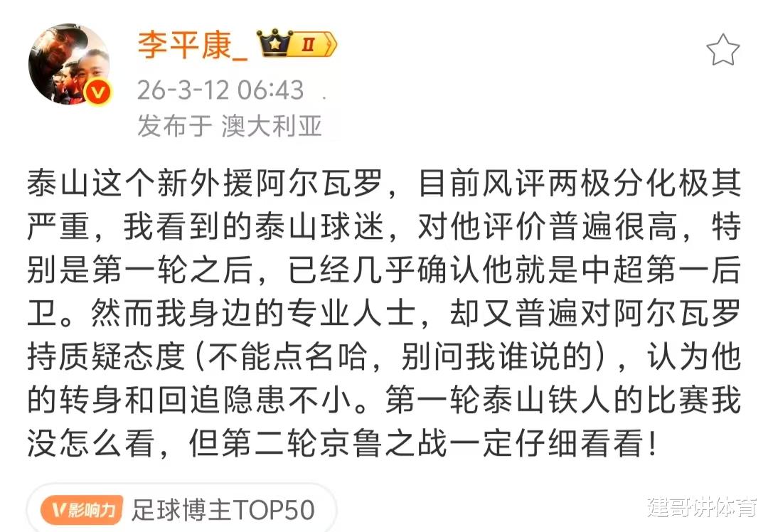 北京时间3月12日,得到了泰山球迷认可的泰山队新外援中卫阿尔瓦罗,被名记李平康点了名,李平康认为泰山球迷对他评价很高,中超第一轮比赛后就确认他是中超中超第一后卫,但我身边的专业人士却普遍怀疑阿尔瓦罗的能力,他的转身和回追隐患不小,第二轮京鲁大战一定要好好看看他的表现。