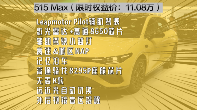 再往上,加1万块钱,11.08万的515 Max版,多了激光雷达,还号称有高速+城区的全场景领航辅助,车机芯片换成8295P,听着是不是很赚?但是,我劝你三思:这个价位的城区领航辅助,有一个算一个,都是“噱头大于实用”!说白了就是不好用!不好用的领航辅助,跟没有一样。而高速领航辅助,说白了就是加强版L2,515 Pro版本来就有基础L2,哨兵模式和倒车辅助也都有。所以现阶段,1万差价,515 Pro版 比515 Max版要值!