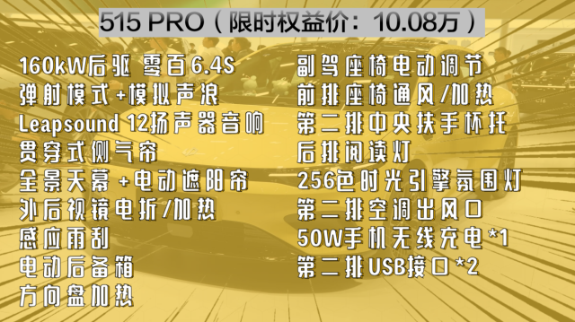 那加8000块钱,上515 Pro版,值不值?直接上图,电机功率提升至160kW,零百加速干到6.4秒,还带弹射模式+模拟声浪,是不是有点小钢炮的感觉了!功能配置上也基本补齐,有了全景天窗和电动遮阳帘,冬天不冷,夏天不晒;前排座椅 电动调节,加热,通风全齐活儿;还有了电尾门、氛围灯、后排出风口,配置不是很高级,但是都很刚需。8000块钱,动力提了、配置齐了、情绪价值拉满了,这才是小钢炮的真正入门款,花小钱办大事,能冲,不亏!