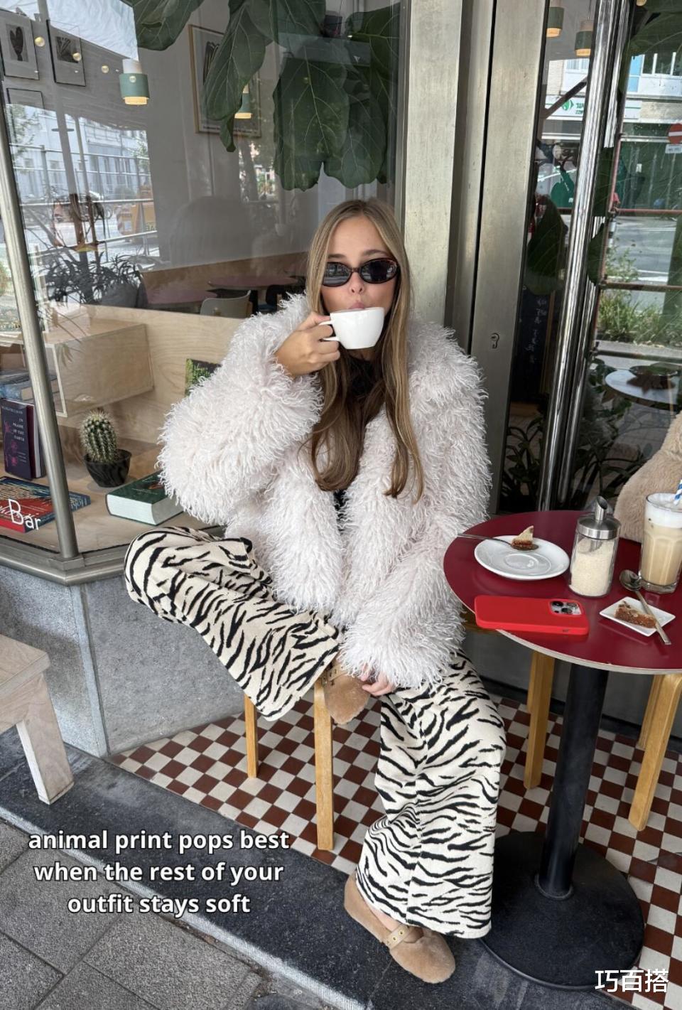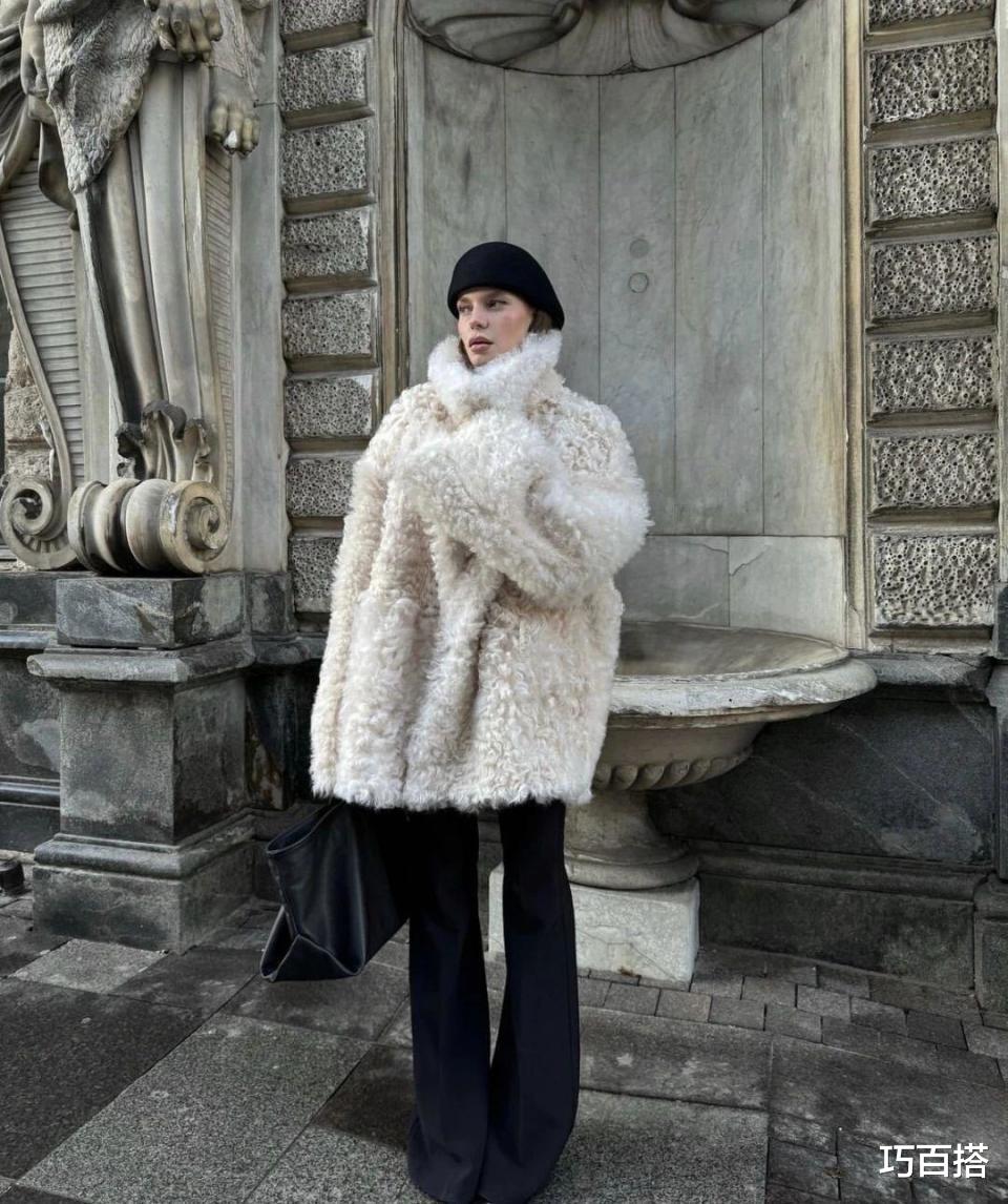 浅色皮草除了米白色系外,还有博主身上这类混毛款皮草,渐变色系既有存在感又高级,高个子女生选择长款气场十足,搭配窄版阔腿裤+驴蹄鞋,英姿飒爽。