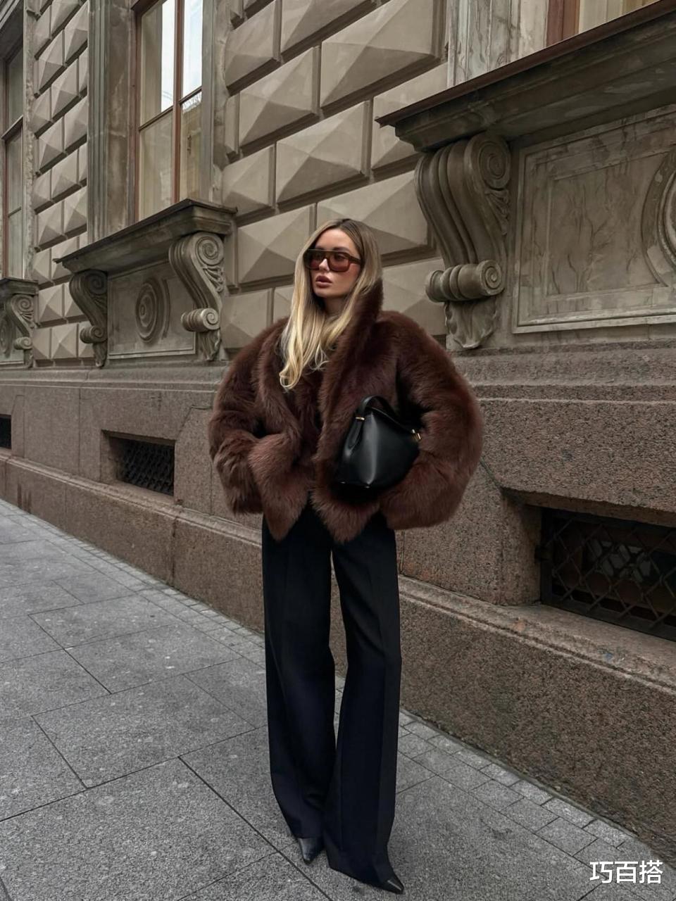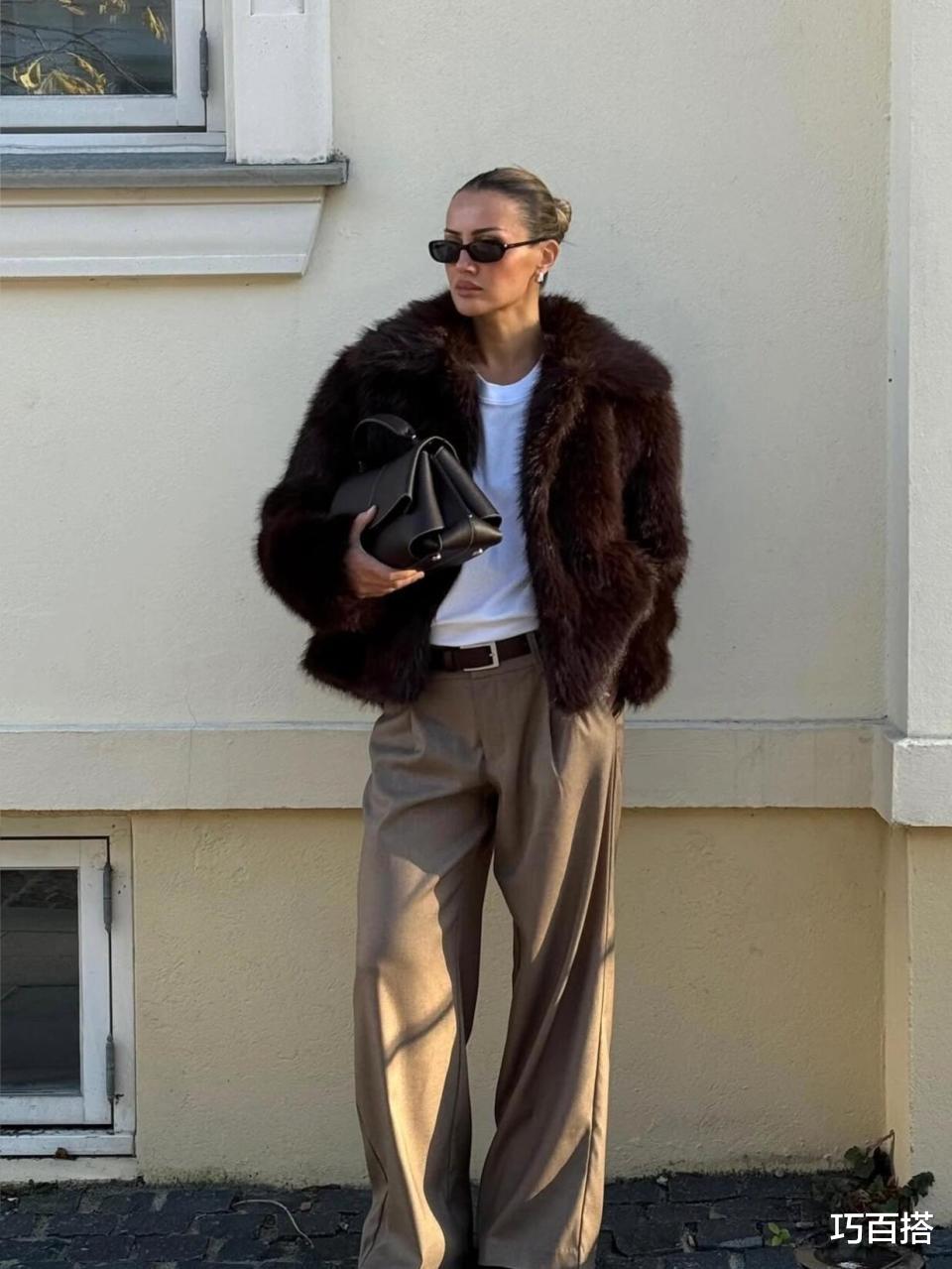 为了最大限度避免出现穿搭错误,在搭配时大家优先借鉴博主身上这一款,咖色皮草与黑色拖地西装裤搭配,简单利落又有排面,气场十足但又不会让人觉得盛世凌人,上班族可以借鉴。