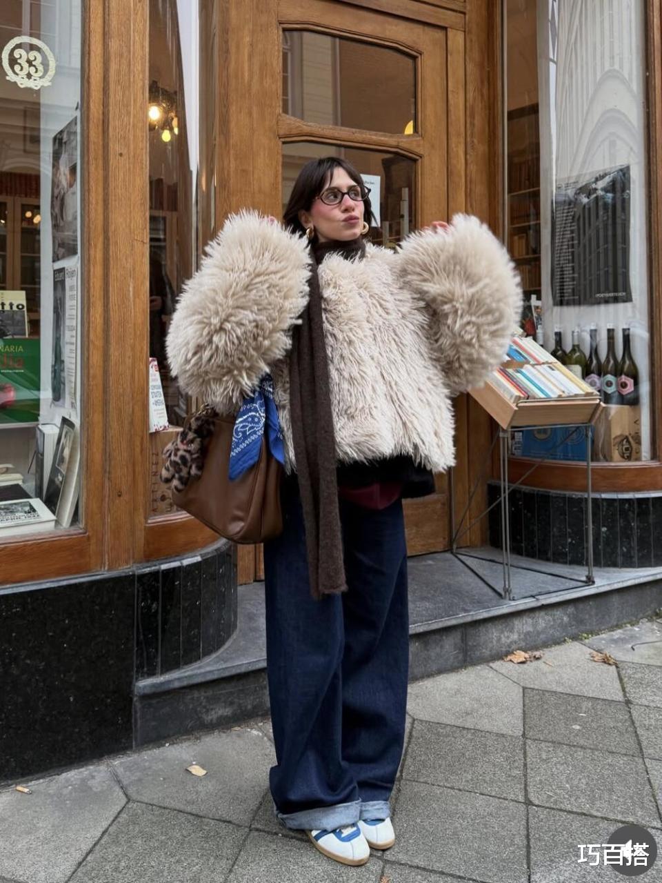 略显蓬松的毛绒质感,既能衬托出小头小脸,又能保证搭配模式不雷同,上松下紧或者同为宽松单品的模式,对绝大多数姐妹来说都是非常友好的,微胖姐妹学习借鉴也不会踩雷。