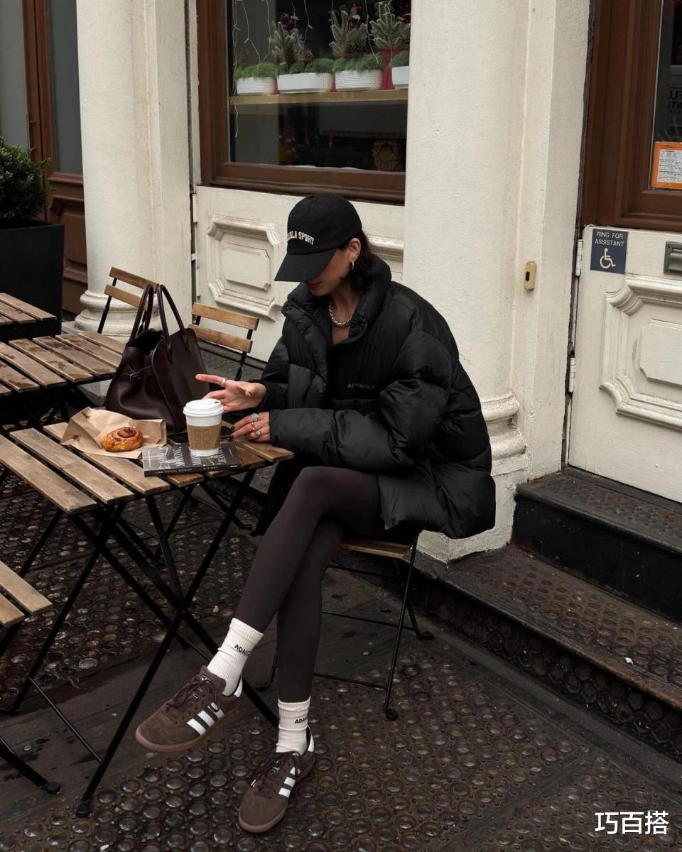 除此之外,大家还可以选择其他任何颜色的羽绒服与之搭配,选择黑色瑜伽裤搭配黑色羽绒服干净利落又显瘦,用白色中筒袜和白色板鞋丰富和提亮整体色调,美观实用。