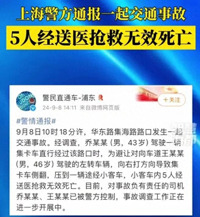 9月8日,一则令人心痛的警情通报在‹警民直通车-浦东›微博上发布。当天10时18分许,华东路集海路路口发生了一起令人震惊的交通事故,导致5人不幸丧生。