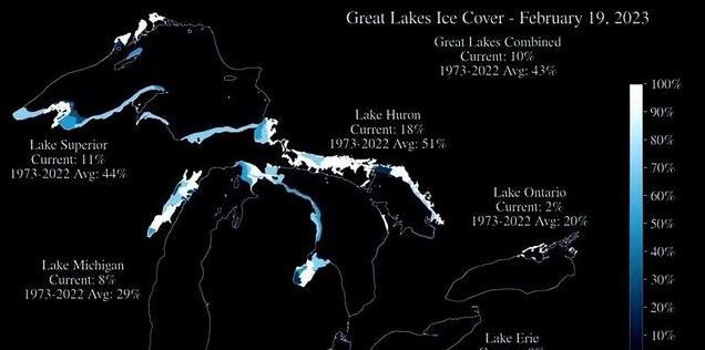 截至2023年2月13日,五大湖的湖冰覆盖率创下历史新低,仅有7%的湖面被冰层覆盖,这与每年此时预计的35 - 40%的冰覆盖率相差甚远。二月初,强烈的寒流曾使五大湖的冰面积短暂上升至21%,但随后冰层面积却持续减少。