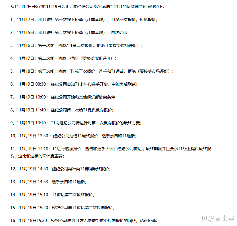 另外Zeus经纪公司还提供了和T1协商的详细世界线,简单来说就是,Zeus经纪公司否认了T1老板的说法,表示已经给T1提供了反向报价,并且之前从来没有说过和T1达成一致,最终T1无法接受Zeus经纪公司的反向报价,协商是失败。另外Zeus经纪公司在看到T1的报价后,一直要求进入转会市场,接受市场评级,这一点应该也是证明了他们觉得T1的报价太低。