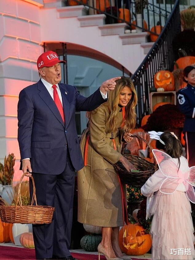 选择与南瓜颜色一样的描边款棕色大衣,既不会雷同又有亮点,亲和力满分。亲自分给小朋友糖果的她是真的接地气,这也是为数不多能看到她温柔一面的时候。