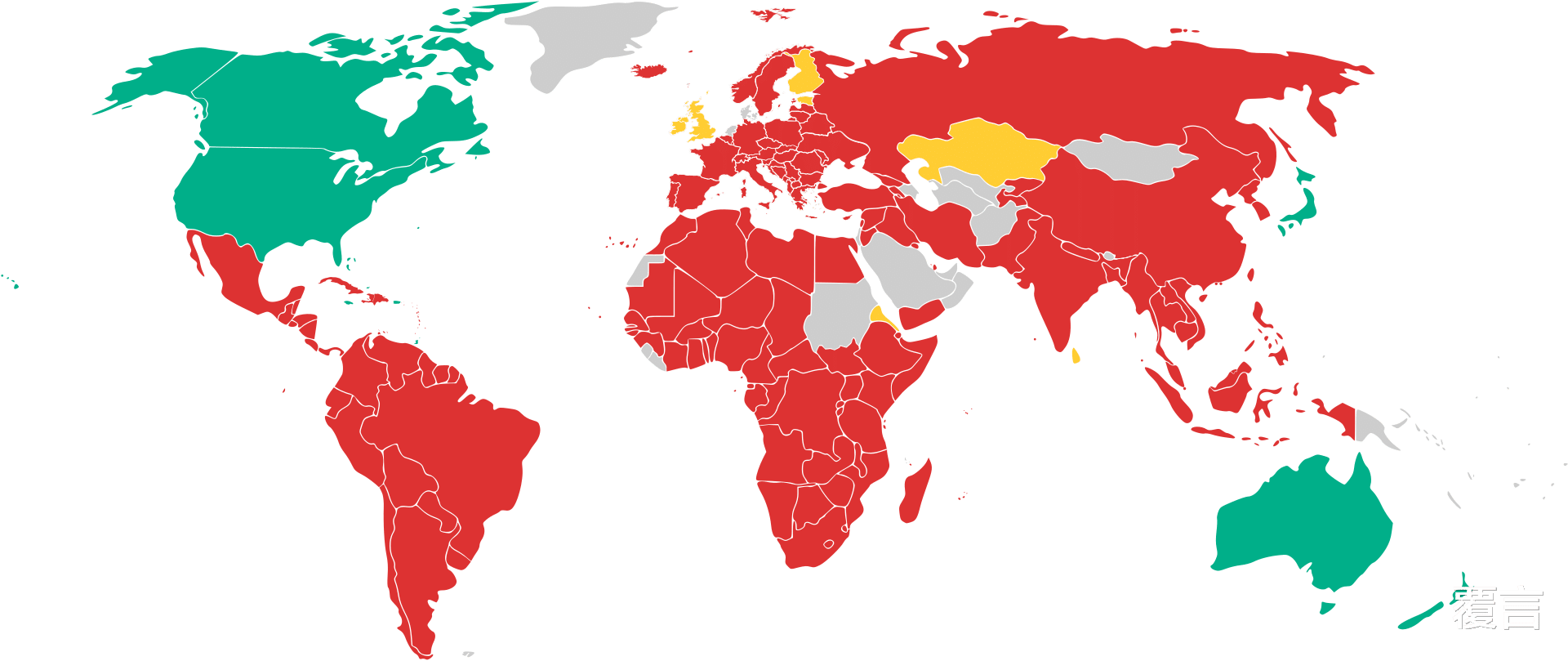 如图所示,标为红色的国家,将“五一国际劳动节”作为公众假日;标为黄色的国家,5月1日有其他的节日;标为绿色的国家,5月1日不是节日,但在其他日期设立了劳动节;标为灰色的国家,5月1日不是节日,也没有设立劳动节。