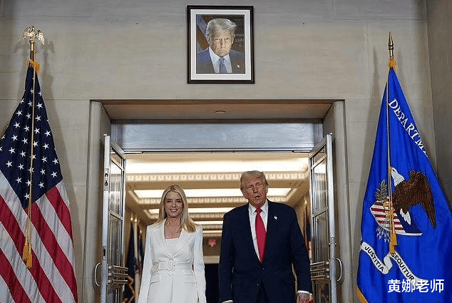 要说这位帕姆·邦迪(下图的金发白衣女士),确实很擅长揣测领导的心意。她上任第一天就把懂王的照片挂到了司法部大门口的正上方。
