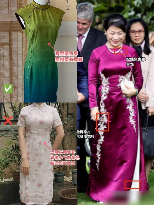 陈月秋选的奥黛,颜色多是素净的墨绿、米白、浅蓝,偶尔用刺绣点缀,没有花哨的亮片或大印花,却把“高级感”三个字写在了衣服上。