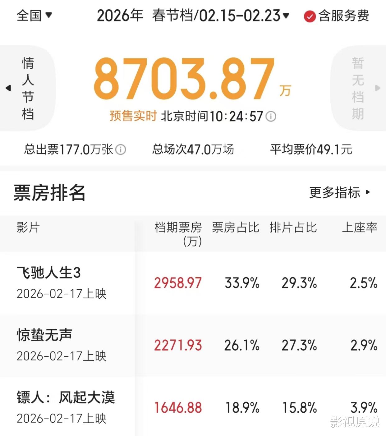 《飞驰人生3》的预售票房成绩遥遥领先于其它影片,稳稳地位居第一名。感觉在正式上映后只要口碑不崩,它就会稳拿档期冠军。