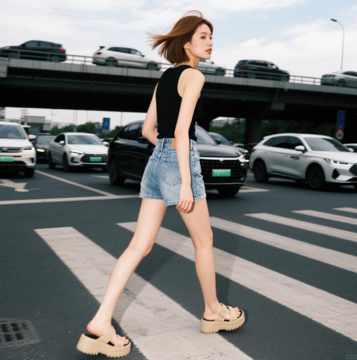 搭配方案:牛仔短裤+黑色背心+米色厚底凉鞋。