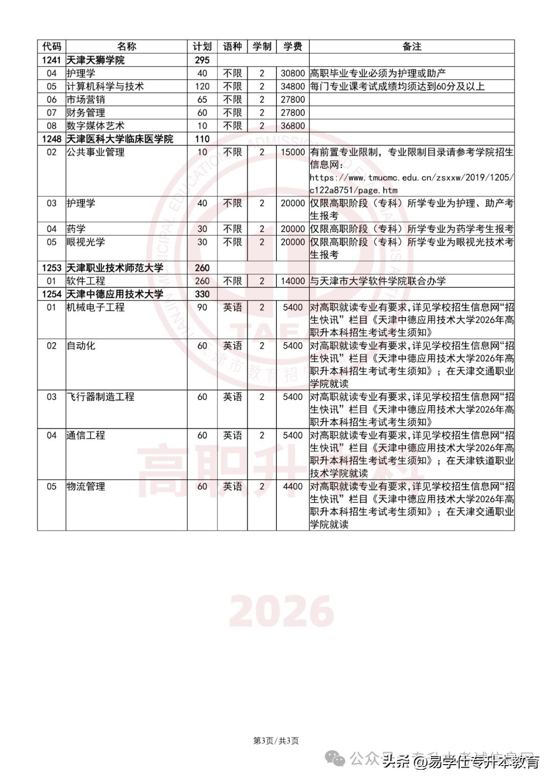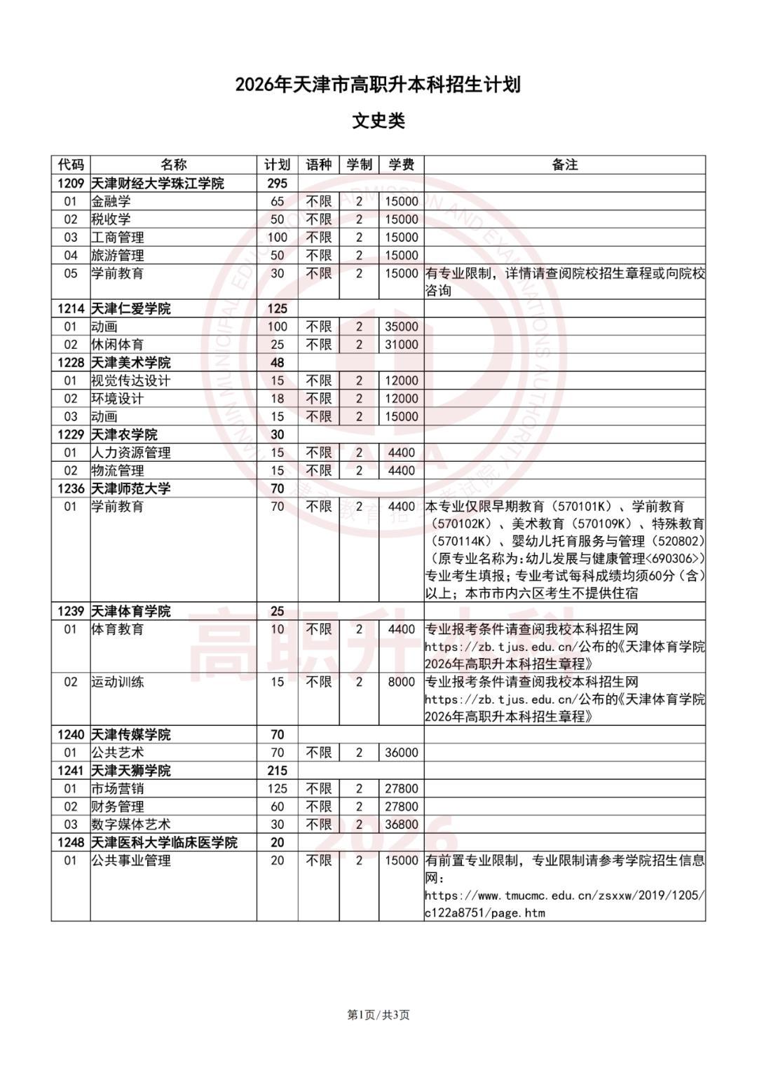 2026年天津市高职升本科招生计划人数