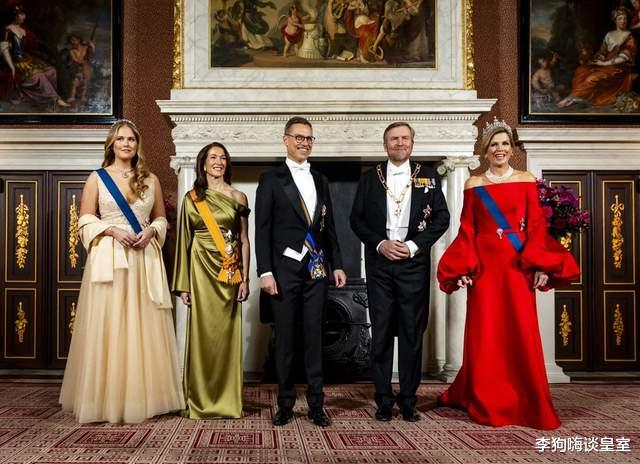 另一边马克西玛王后也没输气场,深红色露肩长裙搭配 Württemberg 珍珠王冠,这顶王冠更有年头,1839 年就打造好了,后来还加了 11 颗梨形珍珠,能换三种戴法,华丽又百搭。国王威廉 - 亚历山大和芬兰总统也都发表了演讲,既谈双边关系又聊支持乌克兰,晚宴场面隆重又温馨。