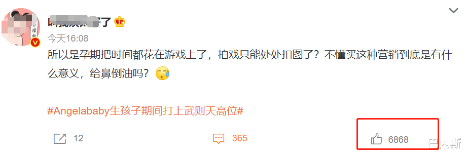 如今一看这不是有一个理由可以解释baby 的不敬业了!原来,当时说自己是个孕妇多么不容易,所以抠图演戏,靠惨博同情。现在却忘记了当时孕妇有多么辛苦,又营造自己怀孕的时候打游戏可厉害了,是个玩游戏厉害的明星的人设。