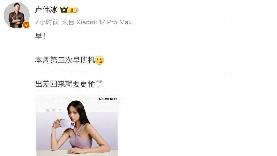 近日,小米卢伟冰发文透露“出差回来就要更忙了”。