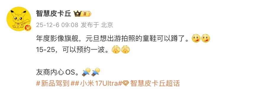 结合爆料中的话题标签来看,这款新机应该就是小米 17 Ultra。也就是说,小米 17 Ultra有望在本月 15-25 日期间亮相。