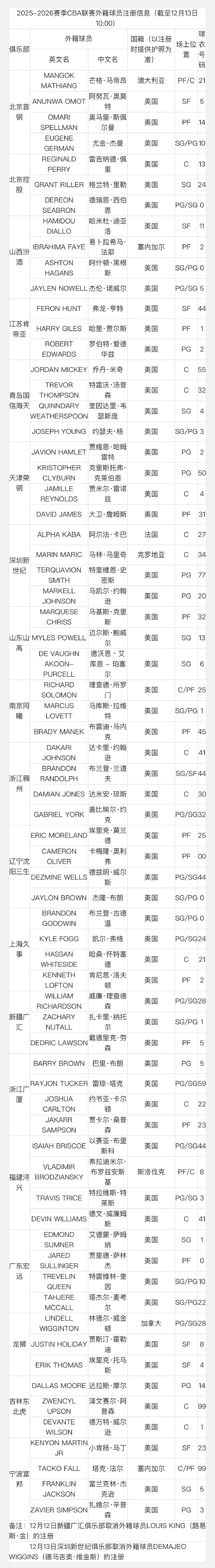 CBA官宣了新赛季外援注册名单,一共是69名外援,其名单有外援的国籍、位置、球衣号码等信息。
