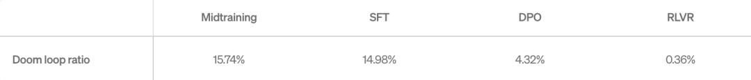 这一方法在一个具有代表性提示词的数据集上,将死循环生成的比例从 15.74%(中期训练阶段) 显著降低到了 0.36%(RLVR 阶段),效果非常直接且稳定。
