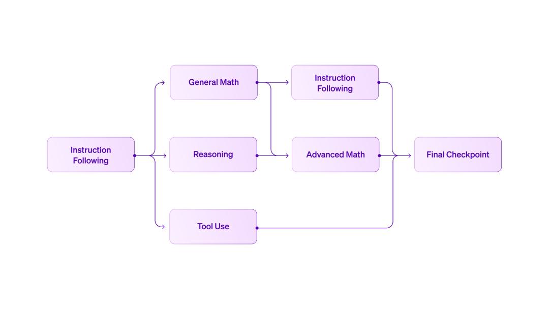 Liquid AI 采用了一种高度并行的 Curriculum RL 训练框架,先以指令跟随的 RLVR 作为基础起点,再分叉出面向推理、数学、工具使用等不同领域的专项 checkpoint。