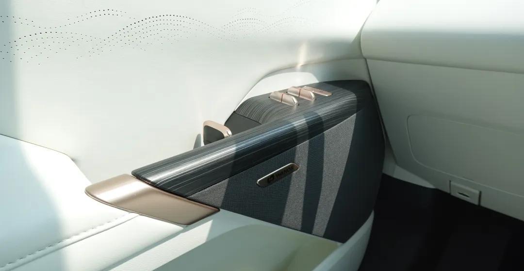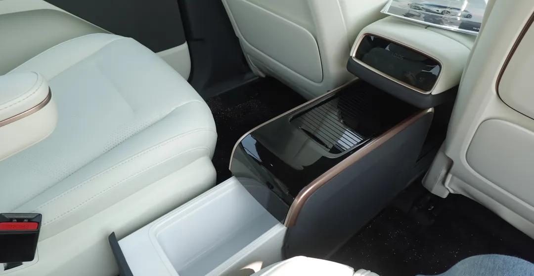 打开车门,进入车内,eπ008的内饰豪华感立即扑面而来。我们试驾的是浅色内饰版本,黑白双拼的中控台、白色的座椅,搭配深色木纹饰板和金色饰条点缀,营造出一种豪华且时尚的氛围。15.6英寸的中控大屏是座舱的视觉中心,搭载高通骁龙8155芯片,保证了车机系统的流畅运行。“可见即可说”的功能也大大提升了实用性。8.8英寸的液晶仪表盘显示效果清晰,UI设计简洁易懂。怀挡设计释放了更多的中控台储物空间,而看似简单的扶手箱下方,却暗藏玄机:它可以与可移动的冰箱组合使用,前后排乘客都能方便取用,设计巧妙。