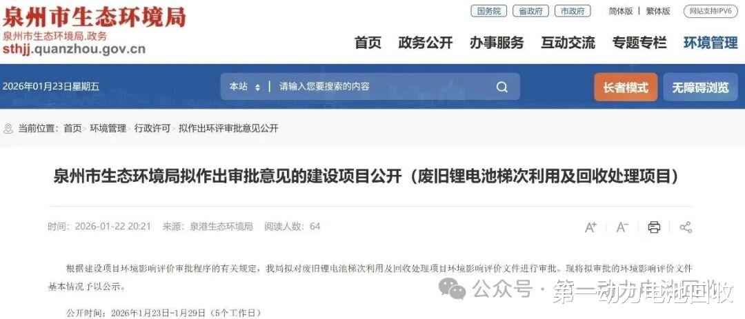 第一动力电池回收消息,近日,福建省泉州市生态环境局发布了对(废旧锂电池梯次利用及回收处理项目)作出审批意见的建设项目公开。