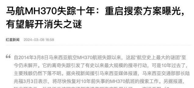 马来西亚政府近日宣布重启对马航370航班失联事件的调查,这一消息立即引起了全球的关注。十年前,这架载有239人的客机在飞往北京的途中突然失去联系,从此杳无音信。尽管时间已经过去十年,但遇难家属的思念和外界的猜测从未停止。