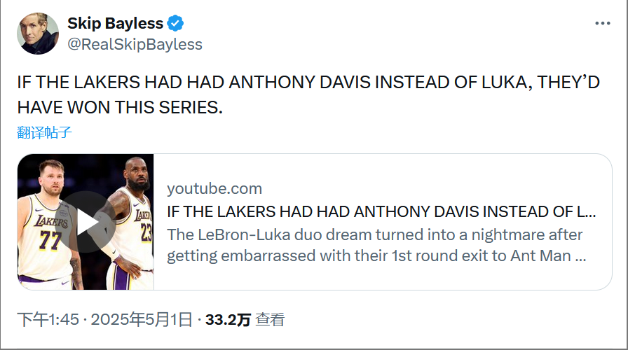 对此,著名评论员Skip发推点评道:“所以,湖人队用NBA最好的内线防守者之一(戴维斯)——一个出色的篮筐保护者——换来了一个防守漏勺(东契奇)。森林狼就是在不断攻击这个弱点,在无人防守的油漆区内轻松得分。我说的没错吧?”