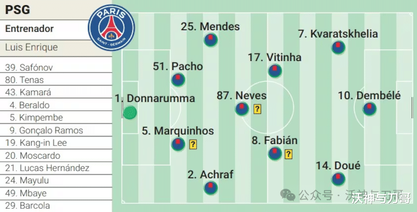多纳鲁马;阿什拉夫、马尔基尼奥斯、帕乔、门德斯;内维斯、法比安·鲁伊斯、维蒂尼亚;杜埃、登贝莱、克瓦拉茨赫利亚