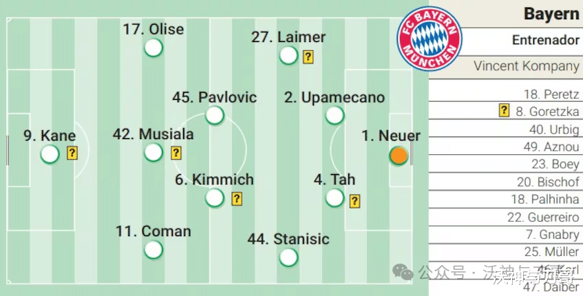 诺伊尔;莱默、若纳坦·塔、乌帕梅卡诺、斯坦尼西奇;帕夫洛维奇,基米希;奥利塞、穆西亚拉、科曼;凯恩
