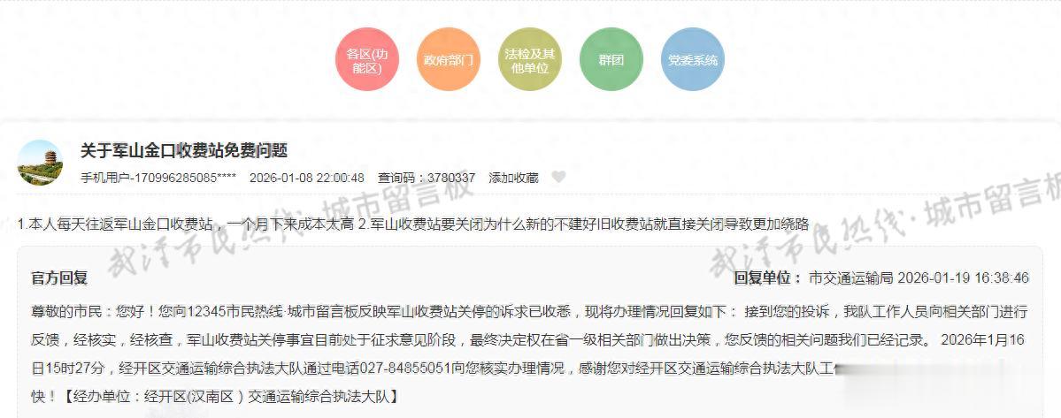 官方回复:经核查,军山收费站关停事宜目前处于征求意见阶段,最终决定权在省一级相关部门做出决策,您反馈的相关问题我们已经记录。
