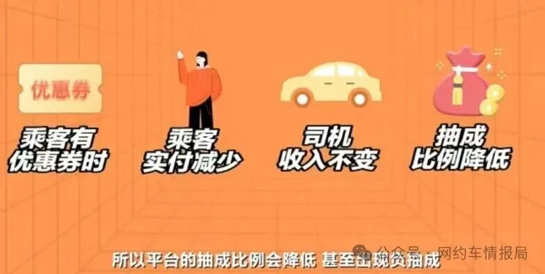 因为司乘是两套相对固定的计价系统,乘客支付的实付金额变少,但是司机的收入并没有变化,这个时候平台的抽成比例就会下降,甚至出现负抽成。